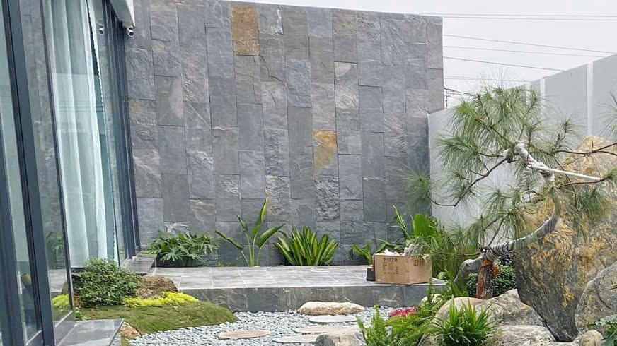 Kết hợp với cây xanh, nước, đá chẻ giúp tạo nên không gian thiên nhiên hài hòa, thư giãn.