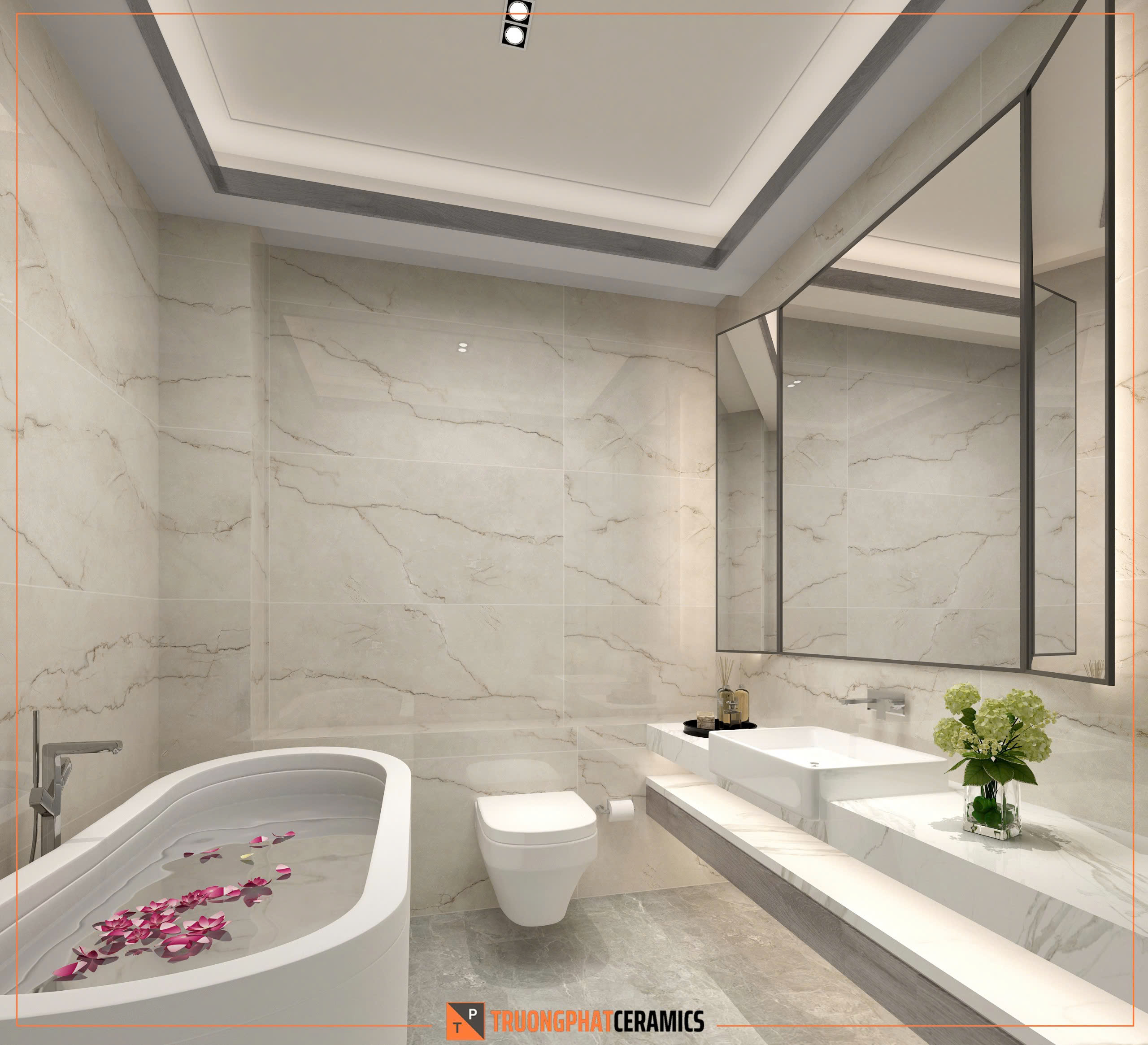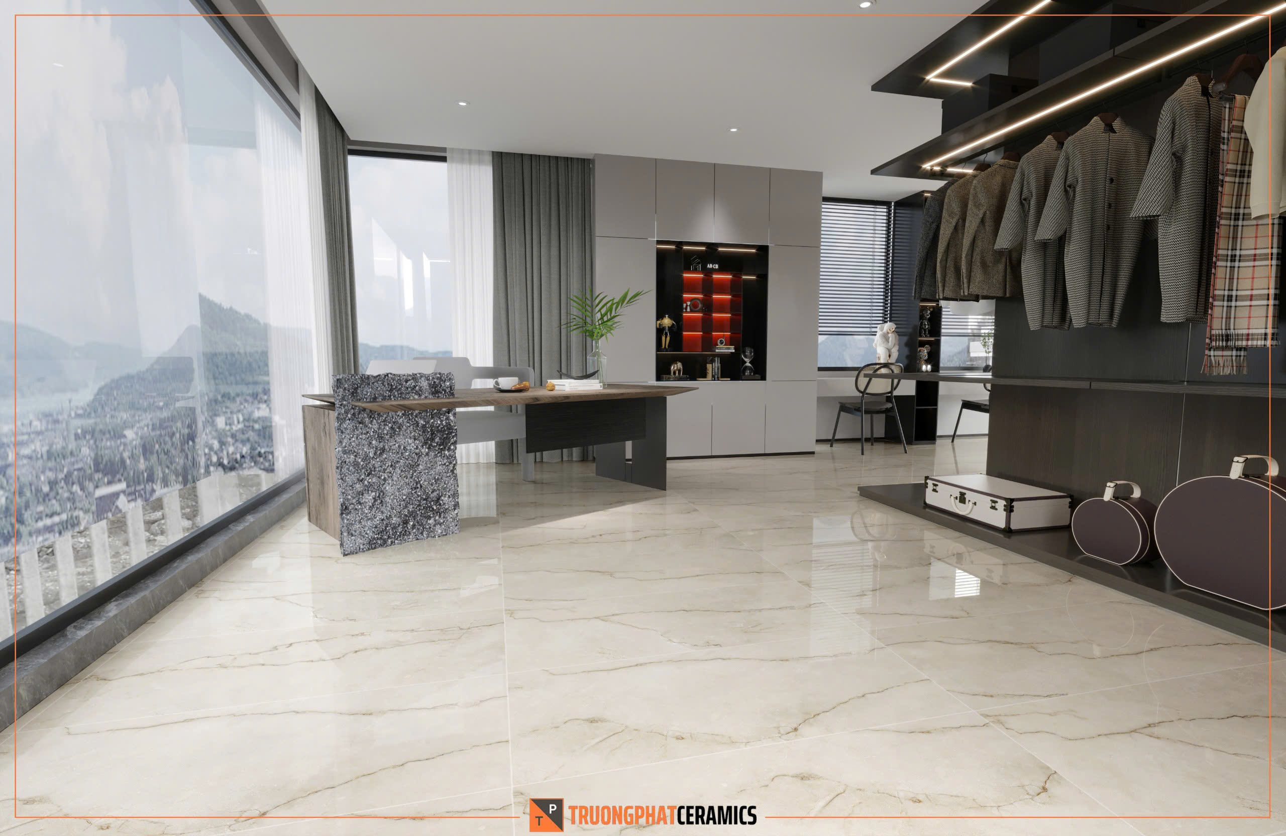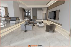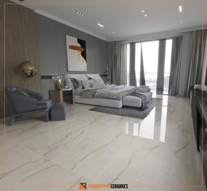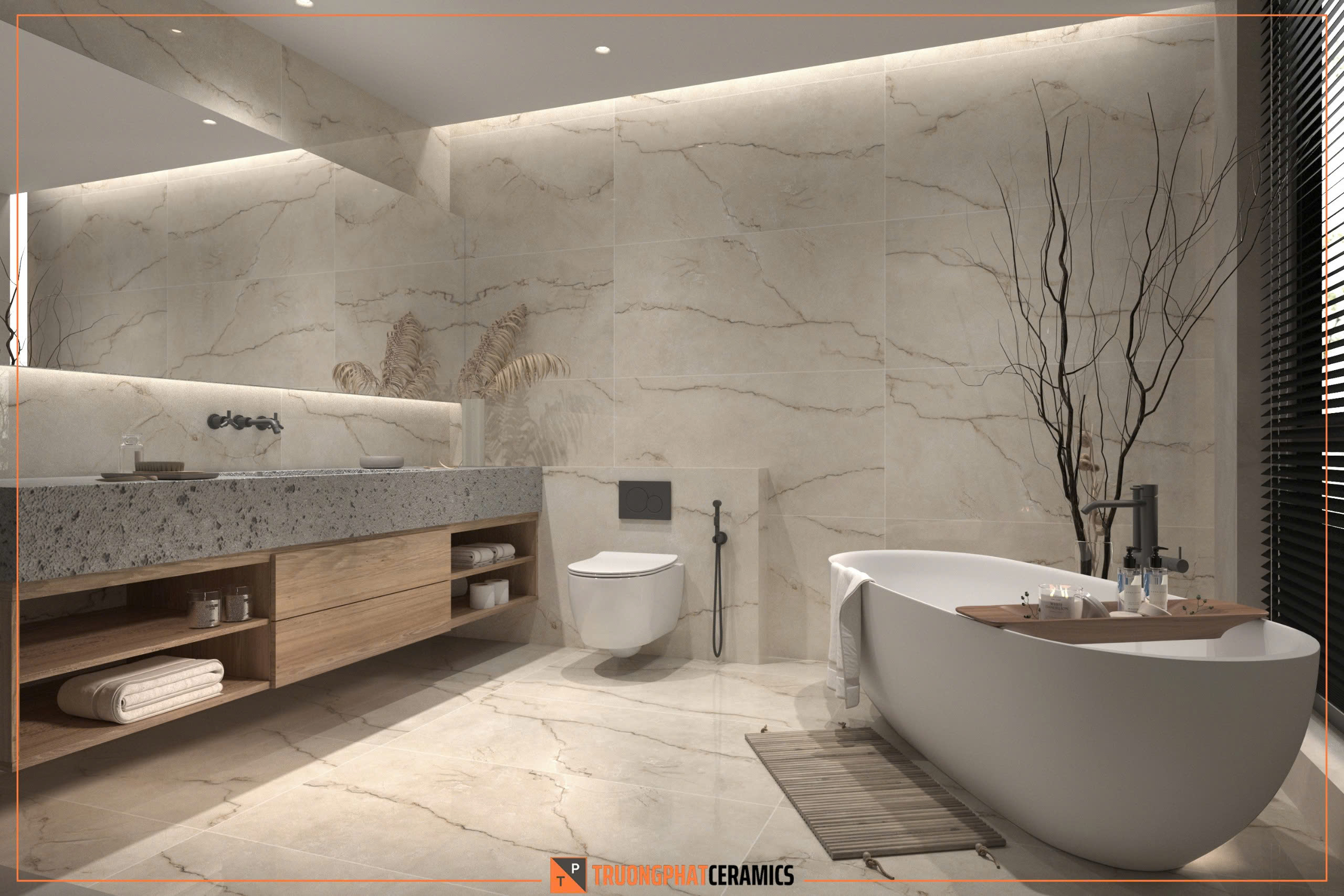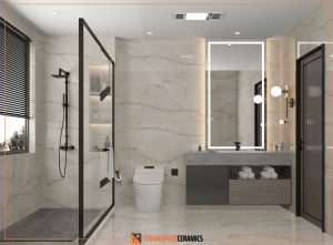 Gạch khổ lớn 60×120 cm đang là xu hướng thiết kế nội thất hiện đại. Không chỉ giúp giảm số lượng mạch gạch (joint line), tạo cảm giác liền mạch, mà còn giúp căn phòng trở nên thông thoáng, sang trọng hơn.